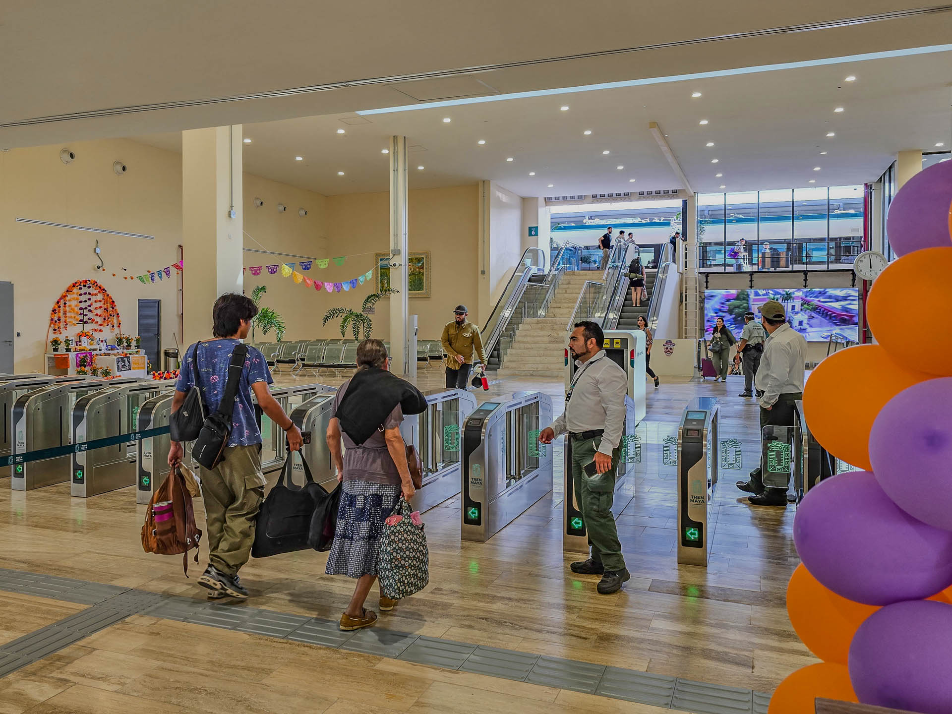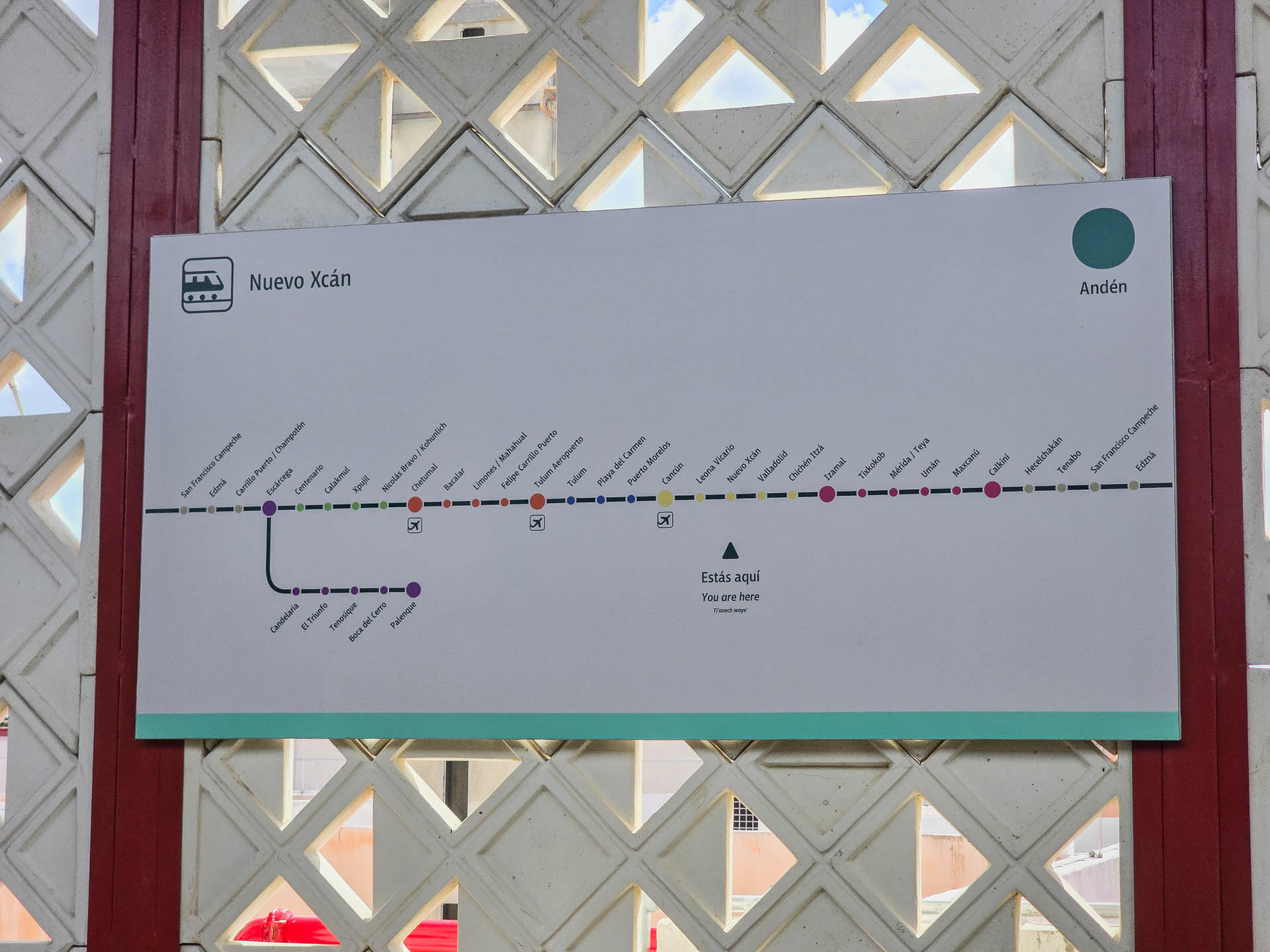 Cancún Aeropuerto: Der Bahnhof liegt direkt am internationalen Flughafen, Zugang über einen kostenlosen Pendelbus vom Terminal zum Bahnhofsgebäude. Wer bereits in Cancún wohnt, erreicht den Bahnhof über einen ADO-Shuttle ab der zentralen ADO-Busstation. Ein Taxi aus der Hotelzone kostet rund 400 Pesos.