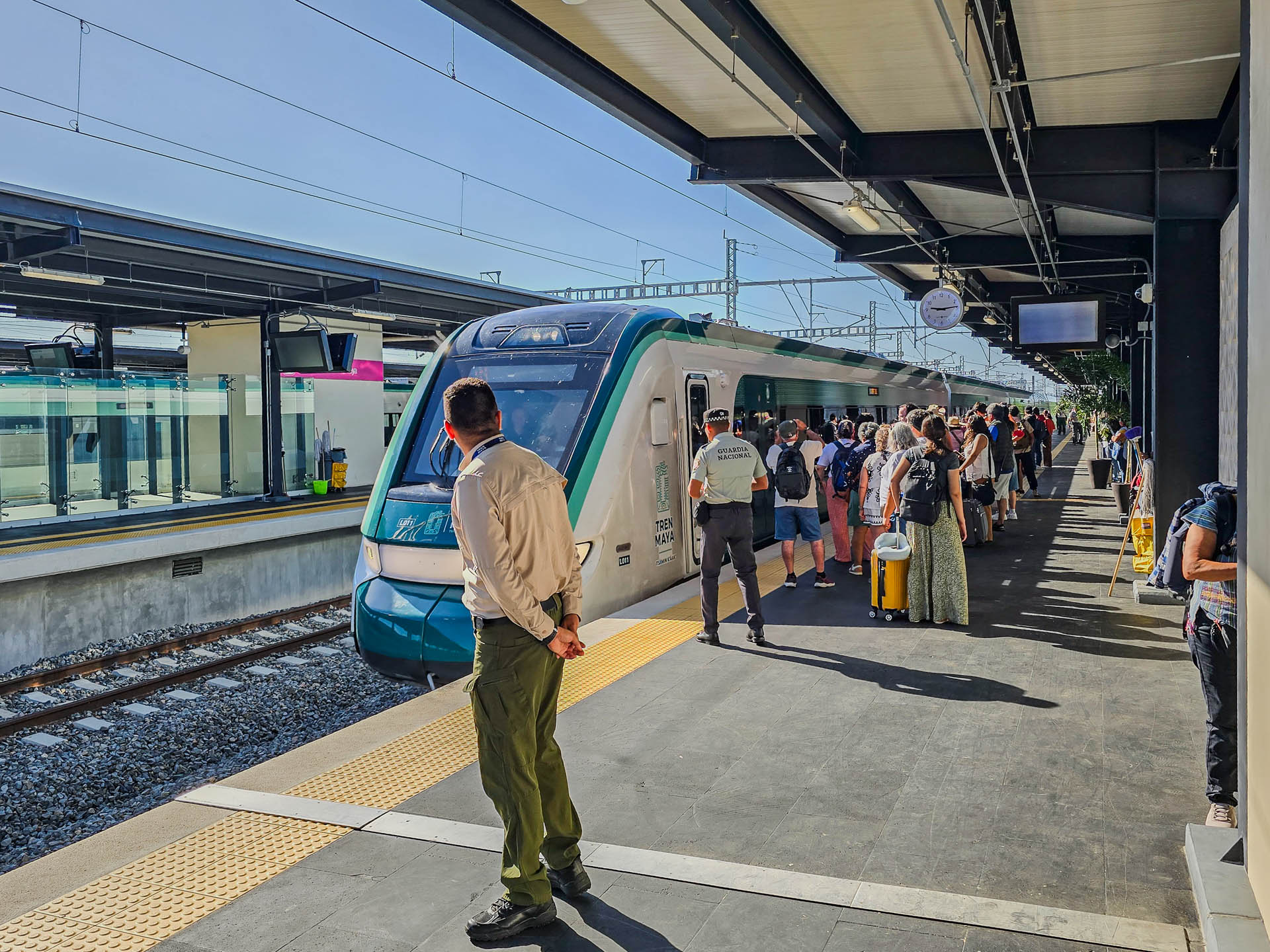 Am Bahnhof mindestens 45 Minuten vor Abfahrt eintreffen. Die Sicherheitskontrollen sind moderat, aber die Zugangswege in Mérida Teya und Palenque sind wegen der Bahnhofsgröße nicht kurz.
